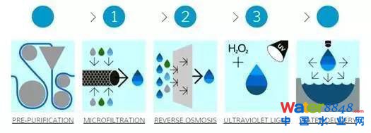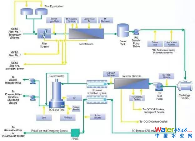 三段深度凈化工藝:GWRS地下水補(bǔ)給系統(tǒng)對(duì)經(jīng)過二級(jí)處理的污水采用結(jié)合了微濾、反滲透和紫外線-過氧化氫的三段深度處理工藝進(jìn)行深度處理,再將其回注到地下含水層中,之后再進(jìn)一步被用于周邊地區(qū)居民的飲用水供應(yīng)。