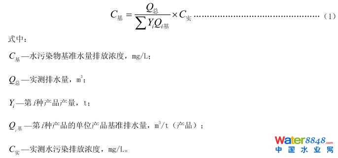 4.3.3若單位產(chǎn)品實際排水量超過單位產(chǎn)品基準排水量,應(yīng)按公式(1)將實測水污染物濃度換算為水污染物基準排水量排放濃度,并以水污染物基準水量排放濃度作為判定排放是否達標的依據(jù)。產(chǎn)品產(chǎn)量和排水量統(tǒng)計周期為一個工作日。