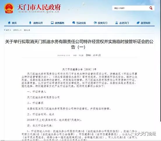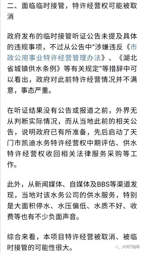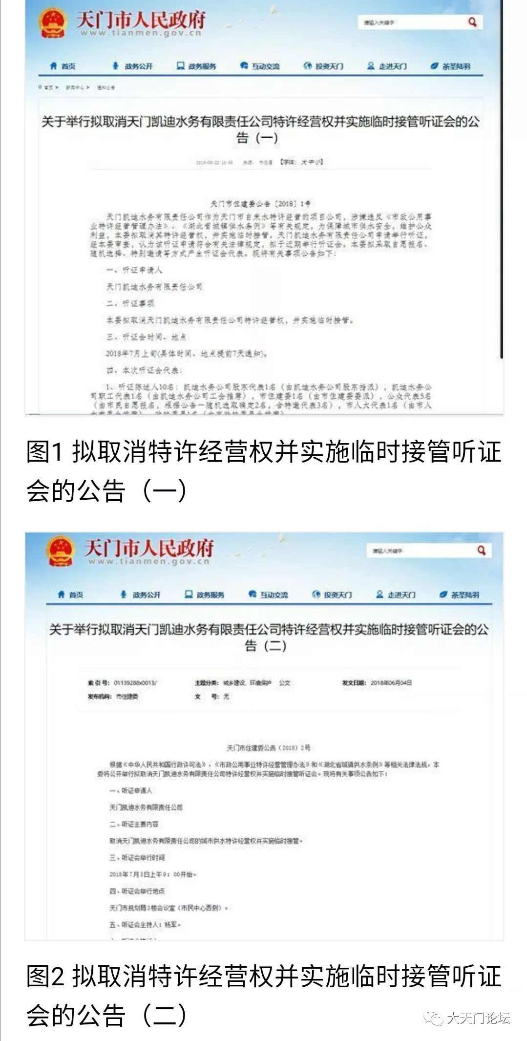 在聽證結(jié)果沒有公告或報(bào)道之前,外界無從判斷實(shí)際情況,而從當(dāng)?shù)卮饲暗南嚓P(guān)公告,說明政府已有所準(zhǔn)備,先后啟動(dòng)了天門市凱迪水務(wù)特許經(jīng)營權(quán)中期評(píng)估、供水特許經(jīng)營權(quán)收回相關(guān)法律服務(wù)采購等工作。