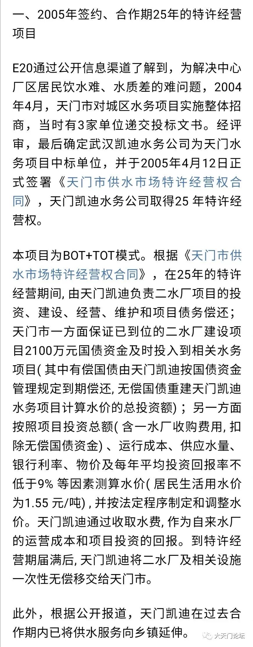 E20通過公開信息渠道了解到,為解決中心廠區(qū)居民飲水難、水質(zhì)差的難問題,2004年4月,天門市對(duì)城區(qū)水務(wù)項(xiàng)目實(shí)施整體招商,當(dāng)時(shí)有3家單位遞交投標(biāo)文書。經(jīng)評(píng)審,最后確定武漢凱迪水務(wù)公司為天門水務(wù)項(xiàng)目中標(biāo)單位,并于2005年4月12日正式簽署《天門市供水市場特許經(jīng)營權(quán)合同》,天門凱迪水務(wù)公司取得25 年特許經(jīng)營權(quán)。
