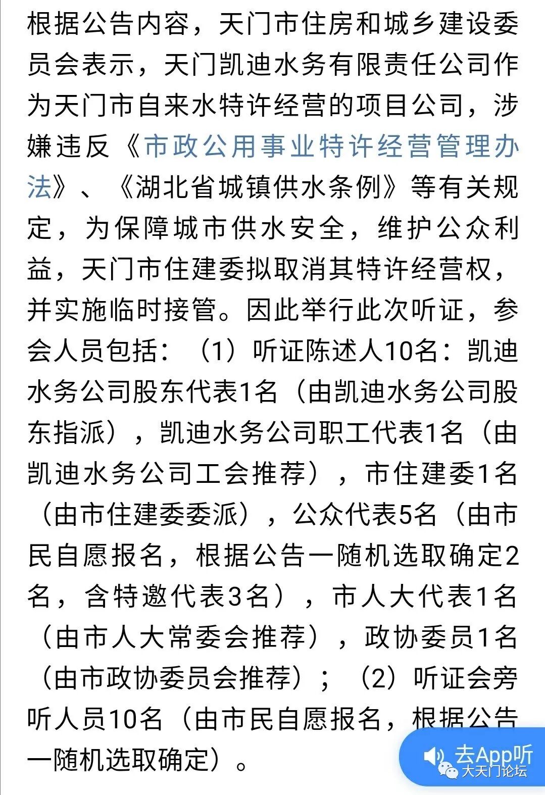 根據(jù)公告內(nèi)容,天門市住房和城鄉(xiāng)建設(shè)委員會(huì)表示,天門凱迪水務(wù)有限責(zé)任公司作為天門市自來水特許經(jīng)營的項(xiàng)目公司,涉嫌違反《市政公用事業(yè)特許經(jīng)營管理辦法》、《湖北省城鎮(zhèn)供水條例》等有關(guān)規(guī)定,為保障城市供水安全,維護(hù)公眾利益,天門市住建委擬取消其特許經(jīng)營權(quán),并實(shí)施臨時(shí)接管。因此舉行此次聽證,參會(huì)人員包括:(1)聽證陳述人10名:凱迪水務(wù)公司股東代表1名(由凱迪水務(wù)公司股東指派),凱迪水務(wù)公司職工代表1名(由凱迪水務(wù)公司工會(huì)推薦),市住建委1名(由市住建委委派),公眾代表5名(由市民自愿報(bào)名,根據(jù)公告一隨機(jī)選取確定2名,含特邀代表3名),市人大代表1名(由市人大常委會(huì)推薦),政協(xié)委員1名(由市政協(xié)委員會(huì)推薦);(2)聽證會(huì)旁聽人員10名(由市民自愿報(bào)名,根據(jù)公告一隨機(jī)選取確定)。