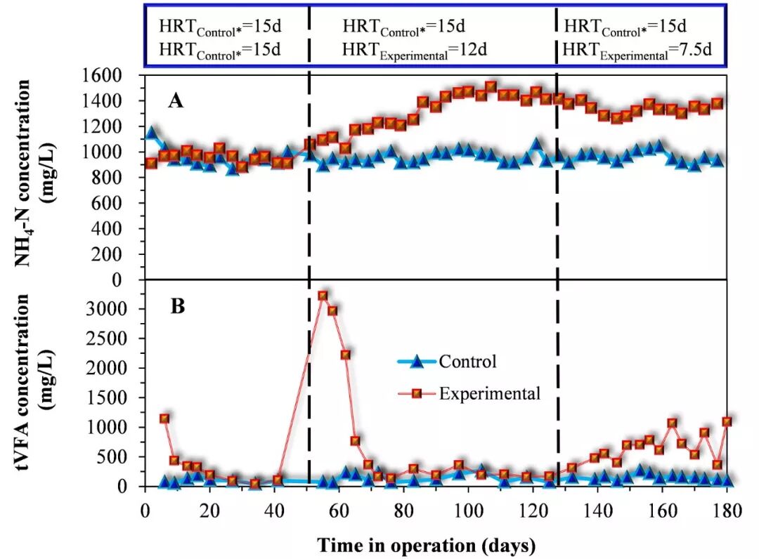 第3階段VFA積累并未引起AD反應(yīng)器的酸化。實際上,實驗組反應(yīng)器pH(7.29±0.01)高于對照組反應(yīng)器pH(7.25±0.01)。這主要是因為而氨氮濃度在第2階段和第3階段均明顯高于對照組(圖3A),其穩(wěn)定階段分別增加了47%和38%。氨氮濃度的增加對于實驗組厭氧反應(yīng)器的穩(wěn)定運(yùn)行起到了重要的輔助作用。