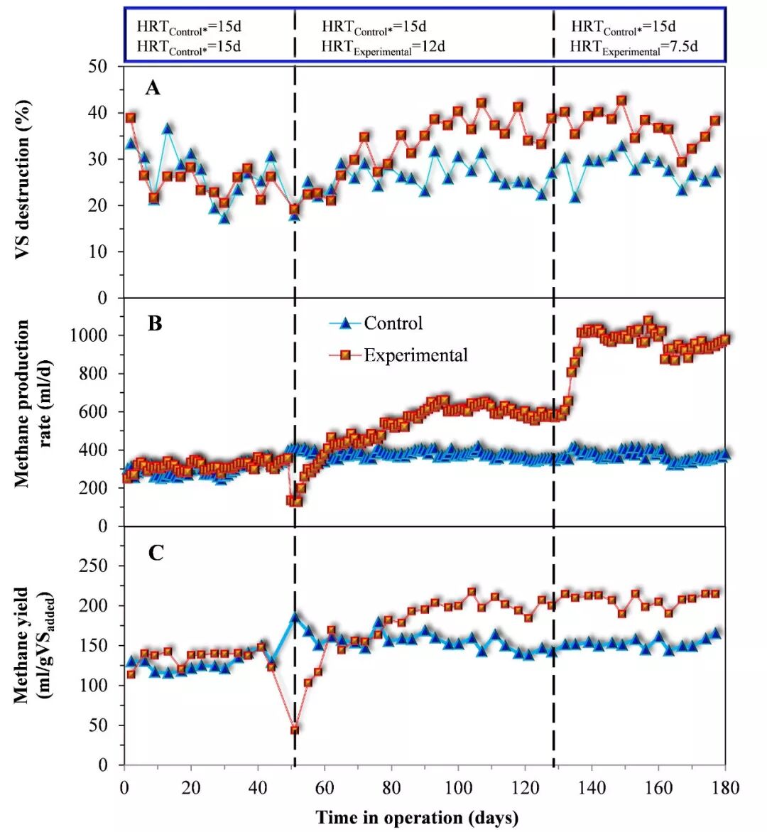 2. 和對照組污泥厭氧消化反應(yīng)器(HRT=15天)比,污泥厭氧消化系統(tǒng)在較低HRT(12天和7.5天)條件下仍能取得更高的VS去除率和甲烷產(chǎn)率(>30%);