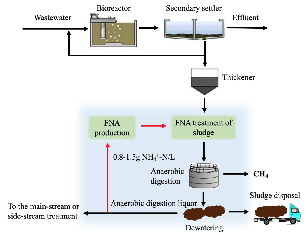 圖1. FNA預(yù)處理技術(shù)提高污泥厭氧消化概念圖(Lodomat工藝)