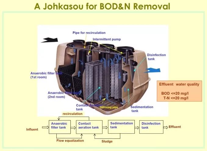 凈化槽(Johkasou)技術(shù)包括處理以家庭為單位的生活污水的小型家用凈化槽、處理樓房和學(xué)校、醫(yī)院、超市等排放的生活污水的大中型凈化槽,現(xiàn)在使用中的凈化槽絕大部分都是小型家用凈化槽。數(shù)據(jù)顯示目前在日本凈化槽的服務(wù)人口超過900萬。日本的凈化槽技術(shù)應(yīng)用范圍很廣,可以處理樓房住宅、醫(yī)院、超市等生活污水,一般由厭氧濾池、接觸曝氣池和消毒池組成,而且能適應(yīng)不同情況的出水要求。