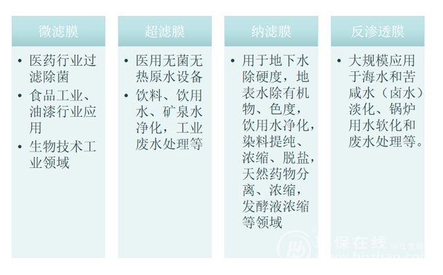 其中超微濾膜主要應(yīng)用與污水處理和中水回用、給水凈化及海水淡化的水預(yù)處理階段;反滲透膜則可有效脫除溶鹽和部分有機(jī)物,對(duì)懸浮物的脫除更徹底,出水水質(zhì)可達(dá)飲用水標(biāo)準(zhǔn),主要應(yīng)用于脫鹽、超純水制造、海水淡化處理。