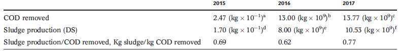 表2 | 2015年,2016年和2017年中國年度市政污水處理COD去除量和污泥產(chǎn)量以及污泥的觀測產(chǎn)率系數(shù)