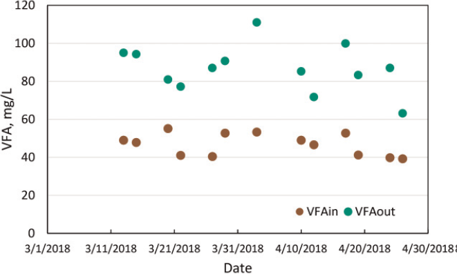 圖1 | 生產(chǎn)規(guī)模初級污泥發(fā)酵中的VFA進(jìn)出,顯示平均增加40 mg-VFA/L [VFA -VFA],溫度16–18°C,NH4-N和磷的凈釋放量分別為2mg/L和1mg/L。