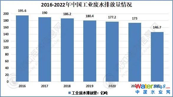 2016-2022年中國(guó)工業(yè)廢水排放量情況