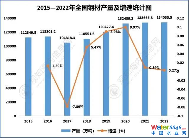 2015-2022年全國(guó)鋼材產(chǎn)量及增速統(tǒng)計(jì)圖