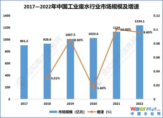 2017—2022年中國(guó)工業(yè)廢水行業(yè)市場(chǎng)規(guī)模及增速