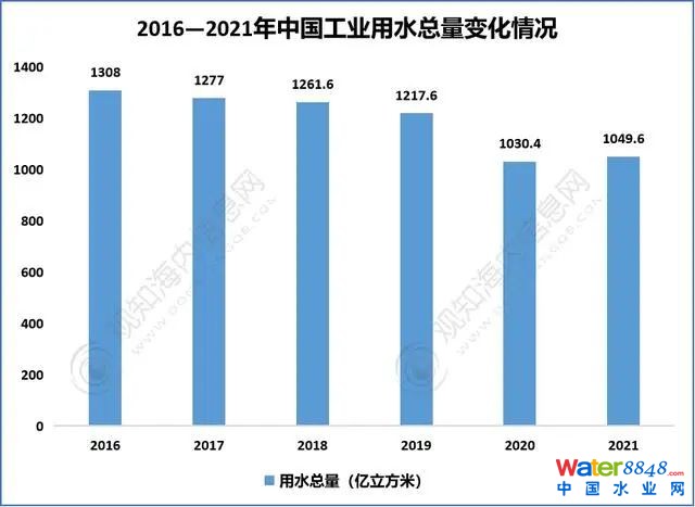 近年來為了減少工業(yè)廢水的排放,我國首先從源頭減少工業(yè)用水量,2015-2020年,我國工業(yè)用水量及占總用水量比例均呈逐年遞減趨勢。2020年我國工業(yè)用水量約為1030.4億立方米,2022年我國工業(yè)用水為968.4億立方米。2021年我國工業(yè)用水量1049.6億立方米,2021年較2020年略有上漲,較2020年增加19.2億立方米。